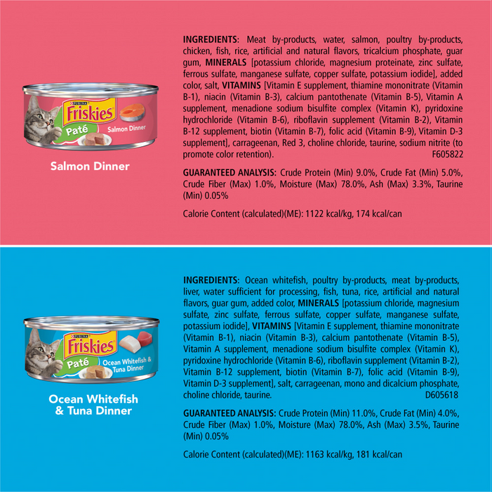 Mariner'S Catch: Fish, Water, Meat By-Products, Liver, Poultry By-Products, Rice, Artificial And Natural Flavors, Tricalcium Phosphate, Guar Gum, Added Color, Minerals [Potassium Chloride, Magnesium Sulfate, Zinc Sulfate, Ferrous Sulfate, Copper Sulfate, Manganese Sulfate, Potassium Iodide], Salt, Vitamins [Vitamin E Supplement, Thiamine Mononitrate (Vitamin B-1), Niacin (Vitamin B-3), Calcium Pantothenate (Vitamin B-5), Vitamin A Supplement, Menadione Sodium Bisulfite Complex (Vitamin K), Pyridoxine Hydrochloride (Vitamin B-6), Riboflavin Supplement (Vitamin B-2), Vitamin B-12 Supplement, Biotin (Vitamin B-7), Folic Acid (Vitamin B-9), Vitamin D-3 Supplement], Carrageenan, Red 3, Taurine. E605418; Sea Captain'S Choice: Fish, Liver, Meat By-Products, Water, Poultry By-Products, Rice, Artificial And Natural Flavors, Added Color, Guar Gum, Tricalcium Phosphate, Minerals [Potassium Chloride, Magnesium Sulfate, Zinc Sulfate, Ferrous Sulfate, Copper Sulfate, Manganese Sulfate, Potassium Iodide], Vitamins [Vitamin E Supplement, Thiamine Mononitrate (Vitamin B-1), Niacin (Vitamin B-3), Calcium Pantothenate (Vitamin B-5), Vitamin A Supplement, Menadione Sodium Bisulfite Complex (Vitamin K), Pyridoxine Hydrochloride (Vitamin B-6), Riboflavin Supplement (Vitamin B-2), Vitamin B-12 Supplement, Biotin (Vitamin B-7), Folic Acid (Vitamin B-9), Vitamin D-3 Supplement], Carrageenan, Salt, Choline Chloride, Taurine. E605918; Salmon Dinner: Meat By-Products, Salmon, Water, Poultry By-Products, Fish, Rice, Artificial And Natural Flavors, Guar Gum, Tricalcium Phosphate, Added Color, Minerals [Potassium Chloride, Magnesium Sulfate, Zinc Sulfate, Ferrous Sulfate, Copper Sulfate, Manganese Sulfate, Potassium Iodide], Salt, Mono And Dicalcium Phosphate, Vitamins [Vitamin E Supplement, Thiamine Mononitrate (Vitamin B-1), Niacin (Vitamin B-3), Calcium Pantothenate (Vitamin B-5), Vitamin A Supplement, Menadione Sodium Bisulfite Complex (Vitamin K), Pyridoxine Hydrochloride (Vitamin B-6), Riboflavin Supplement (Vitamin B-2), Vitamin B-12 Supplement, Biotin (Vitamin B-7), Folic Acid (Vitamin B-9), Vitamin D-3 Supplement], Carrageenan, Red 3, Choline Chloride, Taurine, Sodium Nitrite (To Promote Color Retention). E605818; Ocean Whitefish & Tuna Dinner: Ocean Whitefish, Poultry By-Products, Meat By-Products, Liver, Water, Fish, Tuna, Rice, Artificial And Natural Flavors, Guar Gum, Added Color, Minerals [Potassium Chloride, Magnesium Sulfate, Zinc Sulfate, Ferrous Sulfate, Copper Sulfate, Manganese Sulfate, Potassium Iodide], Vitamins [Vitamin E Supplement, Thiamine Mononitrate (Vitamin B-1), Niacin (Vitamin B-3), Calcium Pantothenate (Vitamin B-5), Vitamin A Supplement, Menadione Sodium Bisulfite Complex (Vitamin K), Pyridoxine Hydrochloride (Vitamin B-6), Riboflavin Supplement (Vitamin B-2), Vitamin B-12 Supplement, Biotin (Vitamin B-7), Folic Acid (Vitamin B-9), Vitamin D-3 Supplement], Salt, Carrageenan, Mono And Dicalcium Phosphate, Choline Chloride, Taurine.