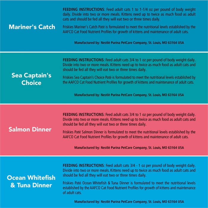 It's anchors aweigh for your cat when you fill your pantry with this Purina Friskies Seafood wet cat food variety pack. Four mouthwatering recipes from our Purina Friskies Pate line bring the flavors of the ocean to your cat's dish, giving her more of the fish tastes she craves. A smooth, pleasing pate texture gives her something scrumptious to sink her teeth into, and the intoxicating aroma tells her that something scrumptious is right around the corner. Rest easy knowing she's getting 100% complete and balanced nutrition for adult cats and kittens in every serving, and watch as she delights in the tempting flavors that are sure to make this wet cat food collection an instant hit for your cat companion. Let her choose a favorite recipe at mealtime, and show her you pay attention to her cravings for rich, delicious seafood flavors.Fill your galley with the seafaring flavors found in this Purina Friskies Seafood wet cat food variety pack. Each package contains four Purina Friskies Pate recipes, including Ocean Whitefish & Tuna Dinner, Mariner's Catch, Salmon Dinner and Sea Captain's Choice. Each variety features an assortment of fish flavors sure to satisfy her hunger, and the pate texture invites her to nibble her way to the bottom of her dish at feeding time. With essential vitamins and minerals in every serving, this wet cat food collection lets you feel good about the foods you serve to your cat companion. The 32-count package offers a convenient way to keep your pantry stocked for your feline family, and the pull-tab cans allow for easy serving. Offer a different recipe as your cat's main entree at feeding time, or rotate between wet and dry foods with our mouthwatering Purina Friskies 7 dry cat food to give her even more tastes and textures to love. We believe that life is better with pets, and that's why we work to make quality the number one ingredient in everything we produce. Each recipe in this collection is formulated to meet or exceed industry standards for cat food, so you can rest easy knowing she's getting meals that are as nutritious as they are delicious. Our team of experts performs rigorous quality and safety checks at every step in the production process to ensure your cat's foods are safe. At Purina, we value sustainability, and that's one reason that every can in this wet cat food collection is conveniently recyclable. Your purchases can help you to make a positive impact on the environment while giving your cat the delicious, nourishing foods she deserves. Make this Purina Friskies Seafood wet cat food variety pack part of your cat's regular diet, and let her know just how much her health and happiness mean to you.