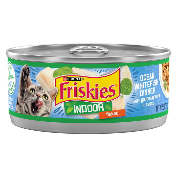 Feed your adult cat the delicious seafood she craves with regular meals of Purina Friskies Flaked Ocean Whitefish Dinner With Garden Greens in Sauce adult wet cat food. The delicate flakes of nutritious ocean whitefish feature high-quality protein that helps her build strong muscles while fueling her daily adventures. Lay out a small dinner dish for her with 1 or 1.25 ounces of wet food for every pound your cat weighs, and watch her come running to eat up every last bite of it. Hearty rice along accents of garden greens in this recipe add the necessary variety to provide a meal that is crafted to be 100% complete and balanced for the maintenance of adult cats' overall health. The sumptuous gravy that bathes every morsel in this wet canned food delights her taste buds and will have her happily purring and licking the bottom of the dish after every meal.Set down a nightly dinner dish of Purina Friskies Flaked Ocean Whitefish Dinner With Garden Greens in Sauce adult wet cat food, and enjoy the feeling of feeding your adult cat the kind of nutrient-packed meal she needs to stay happy and well-nourished. Crafted with real ocean whitefish for essential protein, this hearty meal has the fishy flavor your little carnivore will love to eat. Carved into tender, succulent flakes, the fish in this can is easy for your cat to chew and swallow — before going in for another delicious bite. Savory garden greens help fill out this meal with those extra healthy bits that even a dedicated meat eater needs from time to time. Added vitamins and minerals round out the high-quality nutrition and help promote overall good health. This recipe is crafted especially for your indoor cat to enjoy, so she can have the pleasure of daily seafood meals without the sandy paws. Try diversifying her indoor-specific diet with regular meals of Friskies Indoor Delights dry cat food. With Friskies, taste adventures are just around the corner — but safety comes first. And because you've always done your best to look after your indoor cat, and we always try to help you by providing the highest-quality meals we can for her. That's why all of our products are manufactured in Purina-owned plants in the United States and must pass a stringent quality control system that meets or exceeds state and federal guidelines for pet food. Nothing matters more to us than the quality, safety and nutritional value of the food you feed your cat, which is why we carefully craft every meal to support your cat's whole-body nutrition and to promote overall good health. We're committed to giving you the best we can, because the meals you set out for your cat are the same as the meals we serve our own cats at home. So pop open a can of this Purina Friskies Flaked Ocean Whitefish Dinner wet cat food, and let the taste adventure begin.