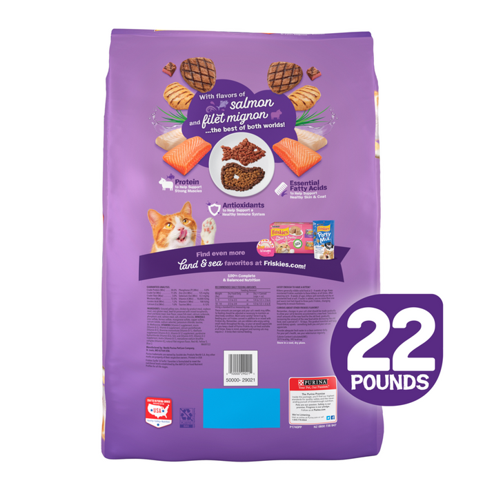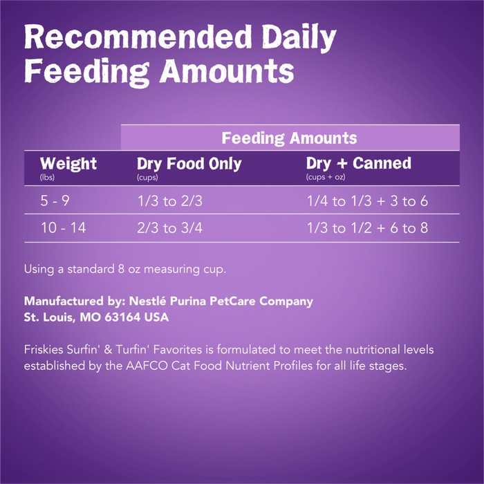 Give your cat a delectable flavor combination with Purina Friskies Surfin' & Turfin' Favorites dry cat food. Chicken, filet mignon, ocean whitefish, liver and salmon flavors deliver all her favorite tastes in one sensational serving, and the appealing shapes keep her excited about the foods you put in her dish. She'll love the enticing aroma, which lets her know something delicious awaits her, and you can feel good about the essential vitamins and minerals found in this tasty dry cat food. Featuring a formula that's complete and balanced for all life stages, this tempting recipe can follow her from her cuddly kitten days to her playful adult years for yummy consistency in her daily diet. Offer up a hearty helping of this Purina Friskies dry cat food every day, and watch as your feline friend gleefully nibbles her way to the bottom of her dish.Tempt your cat's taste buds with the assortment of flavors found in Purina Friskies Surfin' & Turfin' Favorites dry cat food. The beef, poultry and seafood flavors delight her senses with every scrumptious bite, and the enticing aroma leads your cat to her dish at feeding time. Let her hear the sound of the yummy kibble hitting her dish, and watch as she comes prancing in anticipation of a mouthwatering meal. With so much savory goodness in every serving, this dry cat food shows your cat you pay attention to her cravings. For even more variety at mealtime, alternate between this Purina Friskies recipe and our Purina Friskies Cat Concoctions wet cat foods, including Cat Concoctions Scrumptious Salmon & Chicken Liver Dinner Pate, and let her revel in the unique flavor combinations that have been chosen by cats. When it comes to caring for your pet, serving her nourishing, tasty meals is one of your top priorities. That's why we make quality the #1 ingredient in everything we produce. This Purina Friskies dry cat food is formulated to meet or exceed industry standards to give your cat a nourishing, tasty meal. We are proud to produce this recipe in our Purina-owned U.S. facilities, so you can rest easy knowing her meals are coming from a trusted source. Each batch is checked hourly for quality and safety to give you added peace of mind every time you reach for a can. The result is a delectable meal that's as delicious as it is nutritious, making it easy to care for her needs while giving her the flavors she adores. Fill her bowl each day with this purr-worthy Purina Friskies Surfin' & Turfin' Favorites dry cat food, and let your cat know just how much you care about her overall health and happiness with every flavor-filled bite.