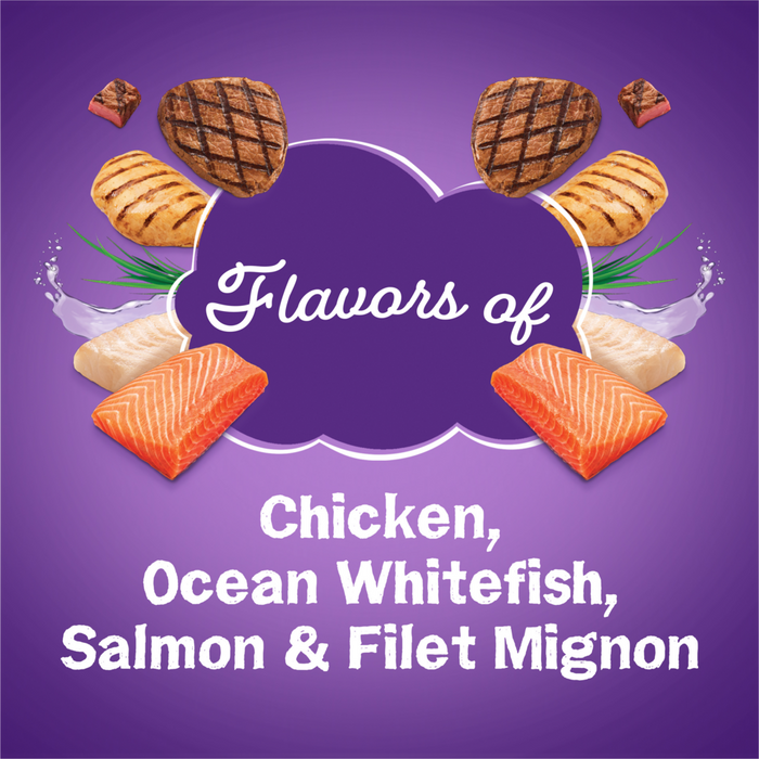 Ground Yellow Corn, Chicken By-Product Meal, Soybean Meal, Corn Gluten Meal, Beef Fat Preserved With Mixed-Tocopherols, Meat And Bone Meal, Liver Flavor, Ocean Fish Meal, Calcium Carbonate, Phosphoric Acid, Salmon Meal, Salt, Choline Chloride, Minerals (Zinc Sulfate, Ferrous Sulfate, Manganese Sulfate, Copper Sulfate, Calcium Iodate, Sodium Selenite), Potassium Chloride, Taurine, Dl-Methionine, Vitamins (Vitamin E Supplement, Niacin (Vitamin B-3), Vitamin A Supplement, Calcium Pantothenate (Vitamin B-5), Thiamine Mononitrate (Vitamin B-1), Riboflavin Supplement (Vitamin B-2), Vitamin B-12 Supplement, Pyridoxine Hydrochloride (Vitamin B-6), Folic Acid (Vitamin B-9), Vitamin D-3 Supplement, Biotin (Vitamin B-7), Menadione Sodium Bisulfite Complex (Vitamin K)), Natural Filet Mignon Flavor, Red 40, Yellow 5, Blue 2. M600122.