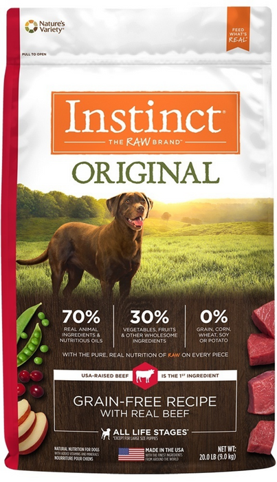 High animal protein, grain-free recipe guided by our belief in raw, instinct original grain-free recipe with real beef unlocks your dog’s potential to thrive. USA-raised beef is the first ingredient – packed with animal protein for strong, lean muscles. 70% real animal ingredients and nutritious oils; 30% vegetables, fruits and other wholesome ingredients; 0% grain. Made without - grain, potato, corn, wheat, soy, by-product meal, artificial colors or preservatives. Guaranteed levels of live, natural probiotics, natural omegas and antioxidants for digestive health, healthy skin & coat, and immune health. The only kibble with the pure, real nutrition of raw on every piece. Made in the USA with the finest ingredients from around the world.