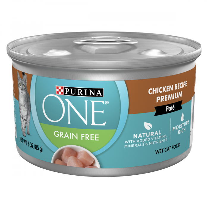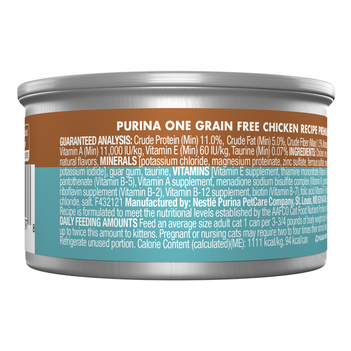 Indulge your cat with the poultry flavor she craves while giving her the nutrition she needs each time you open a can of Purina ONE Grain-Free Classic Chicken Recipe Pate cat food. Providing purposeful nutrition for lifelong whole-body health, this canned cat food features real chicken as the #1 ingredient and offers high-quality protein to help support her strong muscles. Tender, delicate pate tempts her to the dish, and a savory gravy enhances the poultry taste cats love. Keeping her healthy and active is important to you, and this delicious soft cat food is natural with essential vitamins, minerals and nutrients along with antioxidants to help support her immune system. The formula contains added vitamins, minerals and nutrients, so you feel good every time you fill her bowl. Purina ONE Grain-Free Classic Chicken Recipe Pate cat food is made to feed cats of all ages, so it's an ideal canned cat food option for growing kittens as well as active adults.Nourish your precious feline with Purina ONE Grain-Free Classic Chicken Recipe Pate cat food. Featuring the high-protein nutrition your cat needs as a carnivore along with the delectable taste of real chicken and gravy, this classic wet cat food offers 100% nutrition, all the nutrition your cat needs at each life stage. Omega-6 fatty acids aid in keeping her skin healthy and her coat smooth. No artificial flavors, colors or preservatives and 0% fillers means all of the high-quality ingredients have a purpose in your cat's dish. This Purina ONE Grain-Free wet cat food can help promote your cat's healthy hydration in addition to her water dish. Open a can, and feed both her need for nutrition and her desire for delicious taste at mealtime. Introduce your cat to other flavors in the Purina ONE line, including Purina ONE Tender Selects Blend With Real Chicken dry adult cat food. She's sure to enjoy the experience of tender bites and crunchy kibble made with real chicken. Almost 30 years ago, Purina ONE introduced the first cat food to use real chicken as the #1 ingredient, and we've been on a mission to provide high-quality protein canned cat foods in flavors cats love ever since. With over 90 years of innovation in pet nutrition, we're constantly researching and testing formulas and flavors to create delicious, high-quality wet cat food that provides 100% complete and balanced nutrition for your cat. Purina ONE is veterinarian recommended and crafted in Purina-owned U.S. facilities, lending you the confidence you're looking for when feeding your feline. In a typical 24-hour production, Nestle Purina conducts 30,000 quality checks involving ingredients, packaging, receiving, processing and packing, because quality is always the top priority in Purina ONE Grain-Free Classic Chicken Recipe Pate cat food.